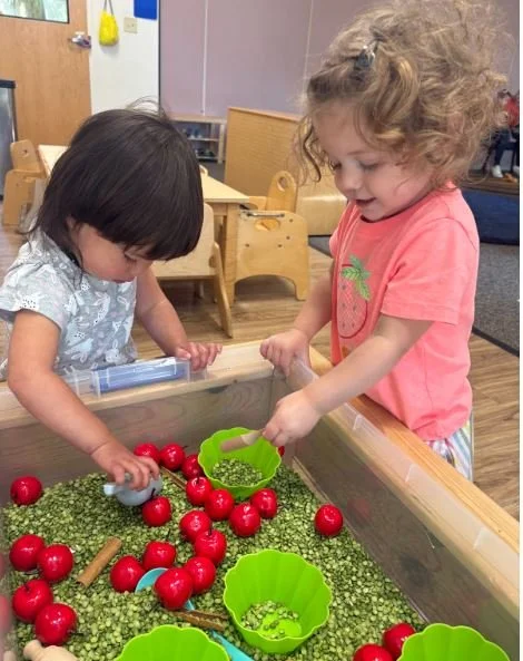 Hand washing has also been introduced, and quickly became one of the more popular “works” in the room. Stepping up to the stool, lifting the handle and watching the water flow from the faucet is very exciting! (We even have one child who washes his hair, scrubbing and mimicking shampooing ;) Since we observed a fascination with water in the sink, we decided to add some pouring work to the sensory bin. The bin is filled halfway with water. We present a miniature, glass pitcher and a bowl. We demonstrate how to dip the pitcher and pour the water into the bowl, “First dip, then pour.” This activity requires focus, so it is a one-child work. We keep towels underneath the bin for safety. It is simple and repetitive, and oh-so-much fun!