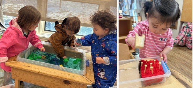 In preparation for Passover, we will practice cleaning work, which is a meaningful activity in both Jewish tradition and the Montessori classroom. The children enjoy table scrubbing work using a small pitcher to pour water, soap, a mini scrub brush, and a washcloth (to dry the table afterward). This practical life activity supports independence, coordination, and care of the environment. The children take great pride in washing and restoring the tables for their friends.